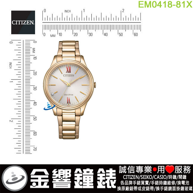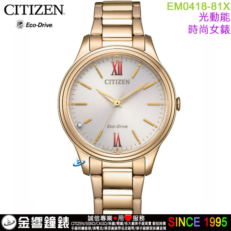 金響鐘錶精品購物網::專賣原廠公司貨:::歡迎議價或門市購買全年優惠 EST.1995 » CITIZEN系列 » LADY'S 時尚女錶 » 【金響鐘錶】現貨,CITIZEN EM0418-81X(公司貨,保固2年):::Eco-Drive,光動能,時尚女錶,5氣壓防水,藍寶石,1顆水晶,E031機芯,EM041881X |