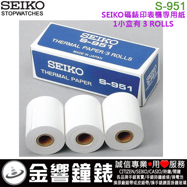 金響鐘錶精品購物網::專賣原廠公司貨:::歡迎議價或門市購買全年優惠 EST.1995 » 其他系列 » 碼錶STOPWATCH » SEIKO S-951碼錶打印紙:::SEIKO原廠碼錶打印紙(一盒共3大卷),1大卷印2800行,刷卡或3期,S951 |