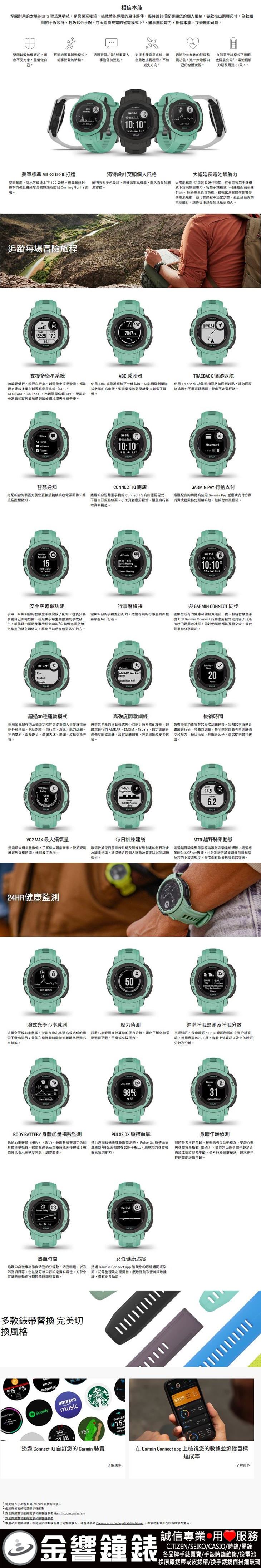 ●預購商品 (※下單前務必透過問與答先詢問貨源※),貨源確認後,下單後約1~3天內寄出 ※注意:預購商品(客訂商品)訂購經確認後,不能取消或更改,新品不良保證換新。※ 金響鐘錶官網 或金響門市還有更多錶款供您選擇!! 金響鐘錶是您購錶的最佳選擇!!! ※賣場沒刊登的其他款式手錶或其他廠牌手錶,都可以利問蝦皮聊聊詢問價格。 ●金響鐘錶販售之GARMIN手錶皆為GARMIN公司原廠公司貨,原廠保固一年(以消費者到台灣GARMIN官網登錄開始保固一年)與原廠錶盒及說明書。 ●原廠建議售價:NT$13,990 ![]() 標準配備:Instinct 2S Solar、專用傳輸 / 充電線、中文操作手冊、台灣Garmin沒有附保證書(保固條件為消費者購買Garmin商品後自行到台灣Garmin官網註冊日開始保固一年)。 |