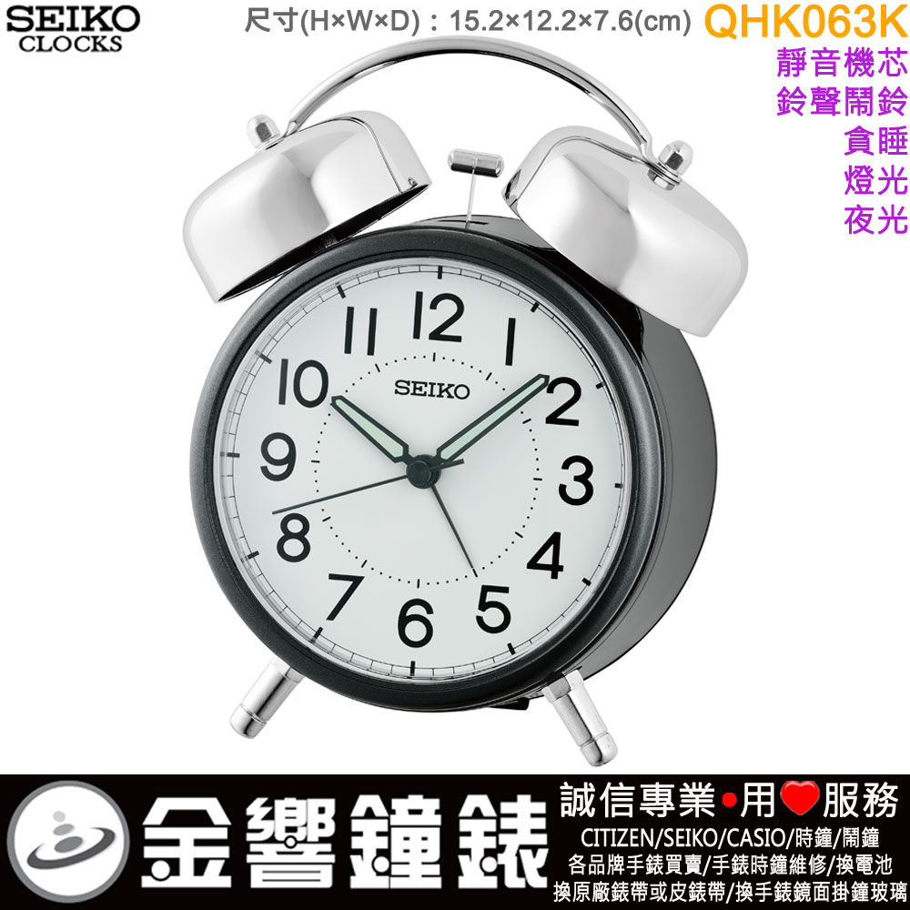 金響鐘錶精品購物網::專賣原廠公司貨:::歡迎議價或門市購買全年優惠 EST.1995 » 時鐘系列 » 鬧鐘 Alarm-Clocks » 指針型鬧鐘(滑動式秒針) » ●金響鐘錶,缺貨,SEIKO QHK063K(公司貨,保固1年):::SEIKO,指針型鈴聲,靜音機芯,鈴聲,貪睡,燈光,夜光,QHK-063K |