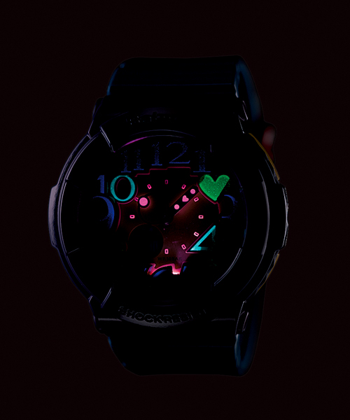 以90年代復古色調為設計概念,將多種具衝擊感的配色混搭於錶帶、錶殼與錶面整點時點時刻。3D立體整點時刻搭配亮彩設計,錶盤層次豐富令人無法忽視,以黑色LED背光融入特殊發光塗料,一按背光錶盤、時刻數字、指針在黑暗中即發散霓虹多彩光亮,以黑色襯底綴飾綠、粉紅、與藍光,更具備耐衝擊構造、世界時間、計時碼表等多項功能。