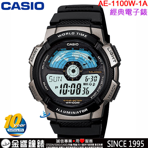 金響鐘錶精品購物網::專賣原廠公司貨:::歡迎議價或門市購買全年優惠 EST.1995 » CASIO系列 » FASHION 時尚錶款 » 【金響鐘錶】預購,CASIO AE-1100W-1AVDF(公司貨,保固1年):::10年電池系列,世界時間,5組鬧鈴,碼錶,倒數計時,AE1100W |