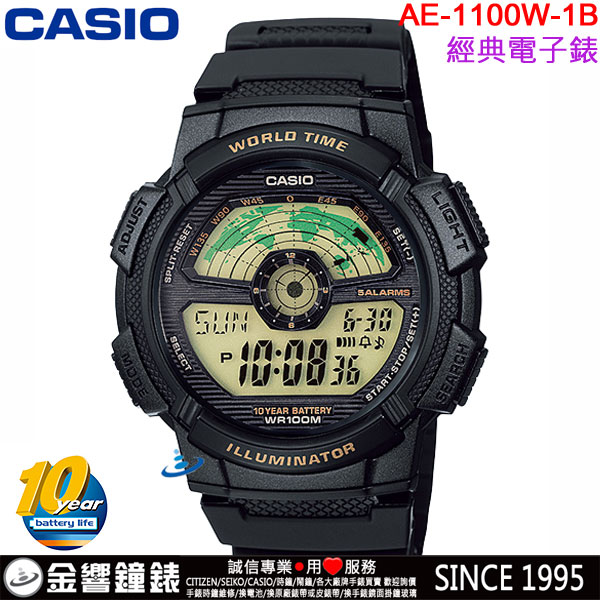 金響鐘錶精品購物網::專賣原廠公司貨:::歡迎議價或門市購買全年優惠 EST.1995 » CASIO系列 » FASHION 時尚錶款 » 【金響鐘錶】預購,CASIO AE-1100W-1BVDF(公司貨,保固1年):::10年電池系列,世界時間,5組鬧鈴,碼錶,倒數計時,AE1100WD |