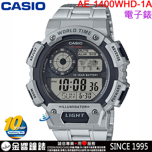 金響鐘錶精品購物網::專賣原廠公司貨:::歡迎議價或門市購買全年優惠 EST.1995 » CASIO系列 » FASHION 時尚錶款 » 【金響鐘錶】預購,CASIO AE-1400WHD-1A(公司貨,保固1年):::10年電力,電子錶,防水200米,世界時間,計時碼錶,手錶AE1400WHD |