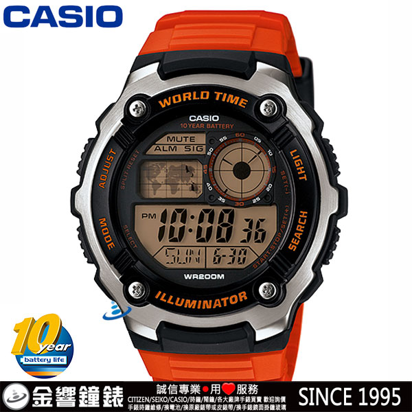 ●金響鐘錶販售之CASIO手錶皆為CASIO原廠代理之公司貨,附有原廠保證書(保固一年)與說明書。![]() CASIO 10年電力電子錶款推出AE-2100系列,以不鏽鋼材質混和樹脂錶帶,共推出3款配色:黑、橘、銀灰。全系列具備防水200米、世界時間、1/100計時碼錶等多項功能。