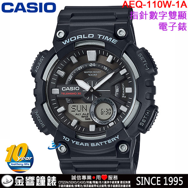 金響鐘錶精品購物網::專賣原廠公司貨:::歡迎議價或門市購買全年優惠 EST.1995 » CASIO系列 » FASHION 時尚錶款 » 【金響鐘錶】預購,CASIO AEQ-110W-1A(公司貨,保固1年):::10年電力,指針數字雙顯,世界時間,30組電話號碼,計時碼錶,手錶,AEQ110W |