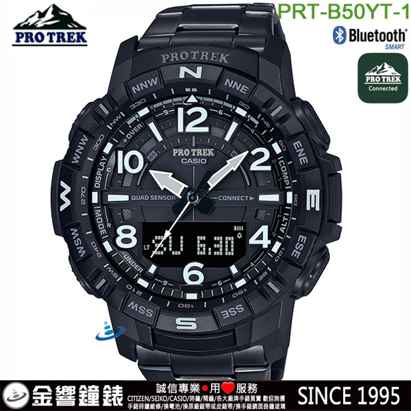 金響鐘錶精品購物網::專賣原廠公司貨:::歡迎議價或門市購買全年優惠 EST.1995 » CASIO系列 » PRO-TREK專業登山錶 » 【金響鐘錶】CASIO PRT-B50YT-1DR(公司貨,保固1年):::藍牙,PRO TREK,專業登山錶,鈦錶帶,雙顯,溫度,高度,氣壓,方位,日出日落,計步器,刷卡或3期,PRTB50YT |