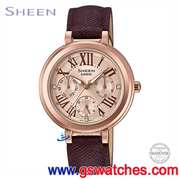 SHEEN 秋冬推出以棕色為主題的全新系列,全系列錶款採用深淺不一的棕色真皮錶帶搭配玫瑰金離子IP處理完成的不鏽鋼錶殼,錶盤時刻皆以羅馬數字設計並鑲嵌上施華洛世奇®水晶,整體細膩精巧的設計,提供一個全新的優雅風格。功能上,SHE-3034GL及SHE-3056PGL採用三針三眼設計,可同時顯示日期、星期與24小時制;而SHE-4029PGL及SHE-3051PGL則為簡約的三針設計,分別搭配獨立的日期顯示窗及錶眼。