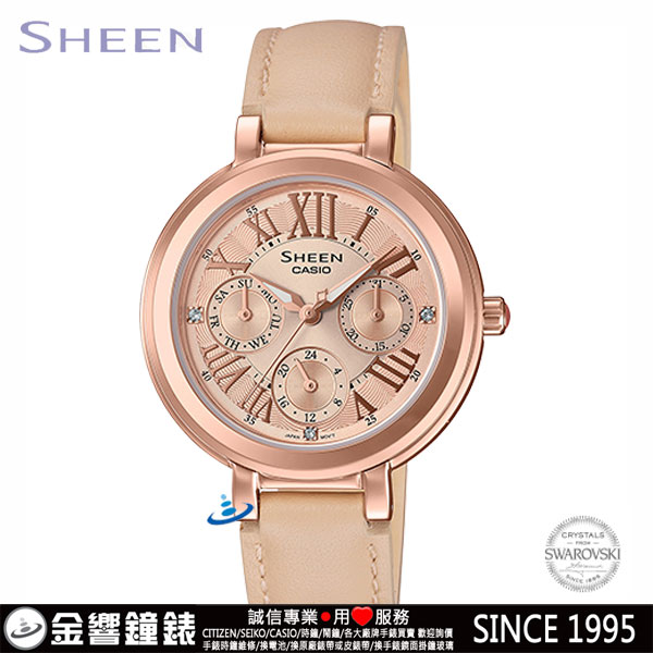 金響鐘錶精品購物網::專賣原廠公司貨:::歡迎議價或門市購買全年優惠 EST.1995 » CASIO系列 » Sheen 錶款 » 缺貨,CASIO SHE-3034GL-9AUDF(公司貨,保固1年):::Sheen,時尚女錶,星期日期,24小時指針,刷卡或3期零利率,SHE3034GL |