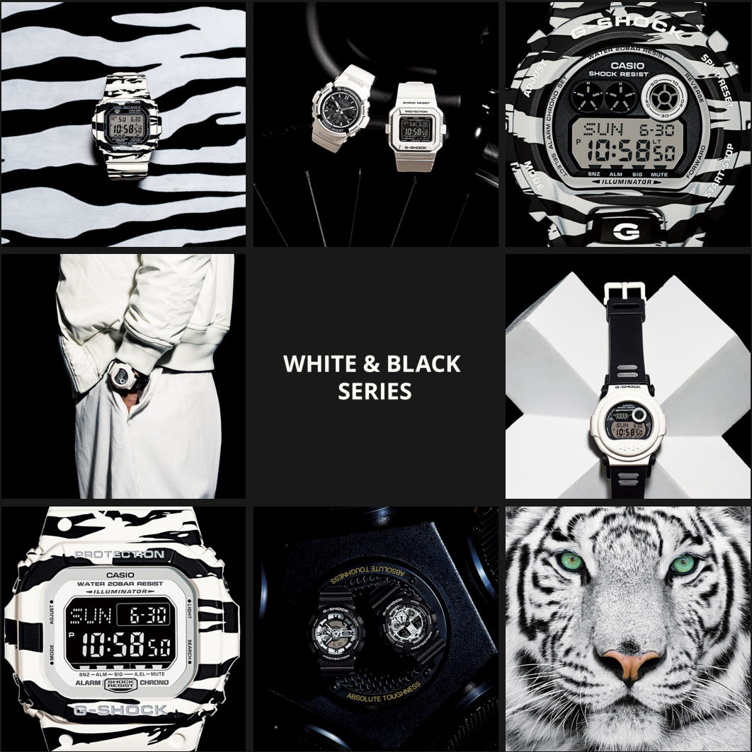不斷持續追求進化的G-SHOCK,採用基本白色/黑色設計完成的「White and Black Series(白&黑系列)」登場。白色的基調,精悍的設計採用反轉液晶,為質樸強有力的單調設計。堅持完成炫酷設計的顏色「白&黑」模型的登場。大錶殼直徑達50mm,超大按鍵操作鈕,錶面經過特殊防滑紋路處理,操作方便迅速,乾淨俐落絕不拖泥帶水。維持G-SHOCK原有的耐衝擊構造與防水200米機能,更增加了抗磁的保護功能。搭載1/1000秒碼錶,並可換算至速度,還有48個城市的世界時間、5組鬧鈴等貼心設計,絕對是真男人的最Man選擇。