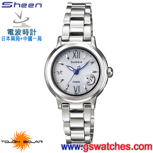 CASIO SHEEN SHW-1500系列以星星點綴精緻優雅的小錶徑圓形錶盤,太陽光芒圖樣錶盤散發耀眼自信的光芒,而日期窗格則以月亮造型呈現。SHW-1500系列搭載三局電波接收功能(日本、中國),可自動校正時刻;而太陽能錶盤讓錶款在接收到陽光或微弱燈光時,可自動轉換成電力,省去經常替換電池的小煩惱。同時搭載指針校正機能,可將受外力撞擊移位的指針校正回正確位置。SHW-1501BDA搭載世界六局電波功能,為海外旅行時的便利校時機能;錶殼與錶帶經黑色離子IP處理,而月亮造型的日期窗則以紫色來突顯冷艷的黑色錶面。