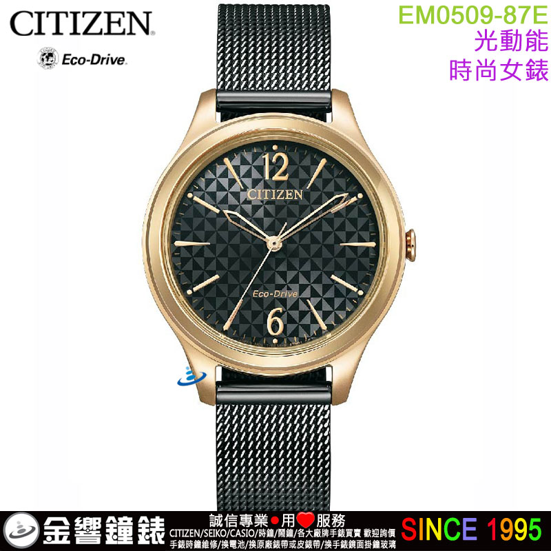 金響鐘錶精品購物網::專賣原廠公司貨:::歡迎議價或門市購買全年優惠 EST.1995 » CITIZEN系列 » LADY'S 時尚女錶 » 【金響鐘錶】現貨,CITIZEN EM0509-87E(公司貨,保固2年):::Eco-Drive,光動能,時尚女錶,5氣壓防水,強化玻璃鏡面,E031機芯,EM050987E |