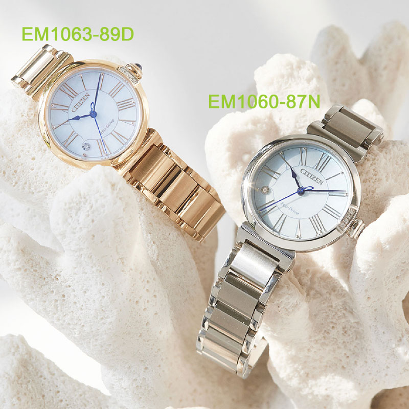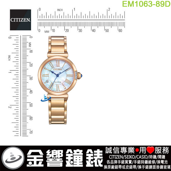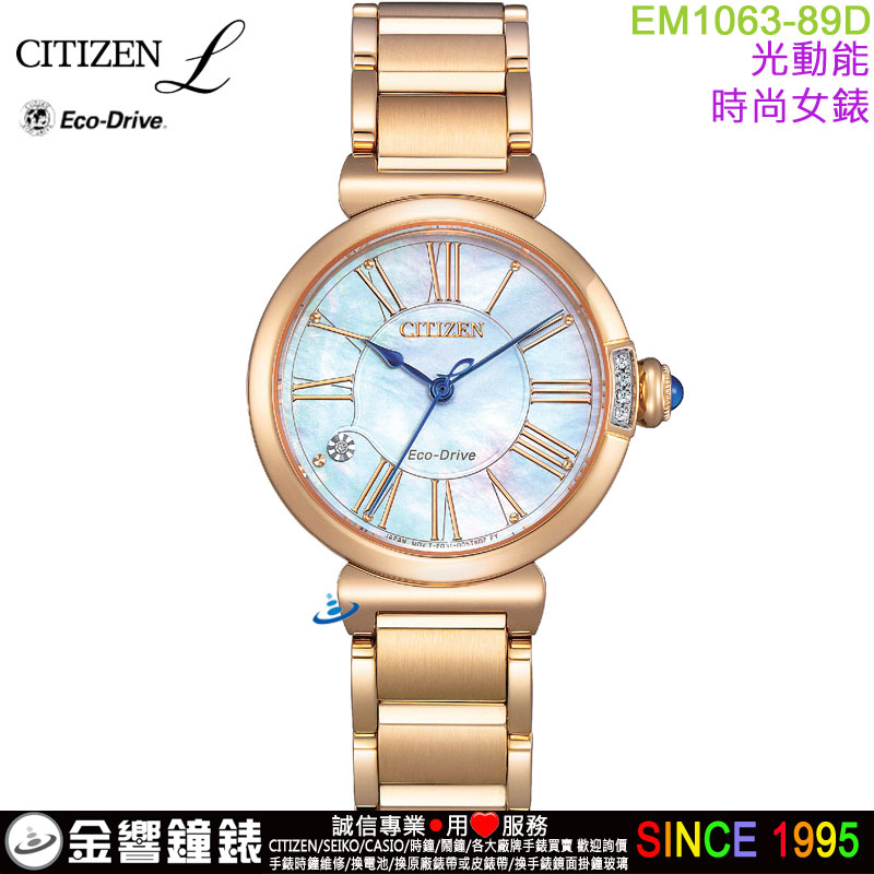 金響鐘錶精品購物網::專賣原廠公司貨:::歡迎議價或門市購買全年優惠 EST.1995 » CITIZEN系列 » L 錶款 » 【金響鐘錶】現貨,CITIZEN EM1063-89D(公司貨,保固2年):::CITIZEN L幸福鈴蘭,光動能,藍寶石鏡面,5顆鑽石,白蝶貝錶盤,時尚女錶,E031機芯,EM106389D |