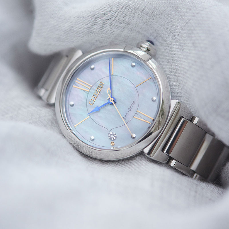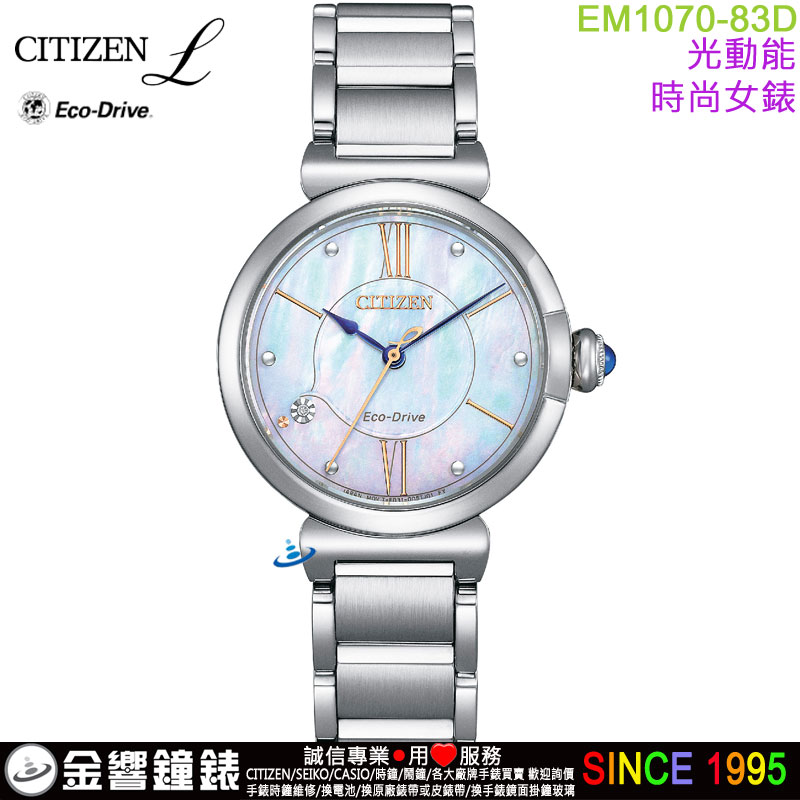 金響鐘錶精品購物網::專賣原廠公司貨:::歡迎議價或門市購買全年優惠 EST.1995 » CITIZEN系列 » L 錶款 » 【金響鐘錶】現貨,CITIZEN EM1070-83D(公司貨,保固2年):::CITIZEN L幸福鈴蘭,光動能,藍寶石鏡面,1顆鑽石,白蝶貝面板,時尚女錶,E031機芯,EM107083D |