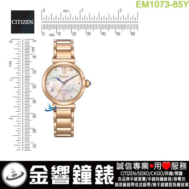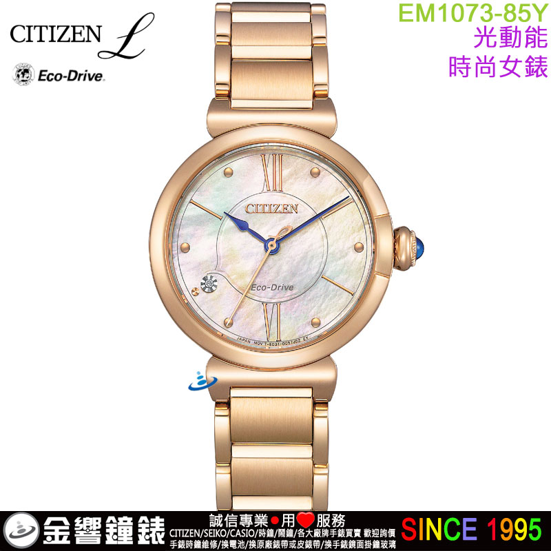 金響鐘錶精品購物網::專賣原廠公司貨:::歡迎議價或門市購買全年優惠 EST.1995 » CITIZEN系列 » L 錶款 » 【金響鐘錶】現貨,CITIZEN EM1073-85Y(公司貨,保固2年):::CITIZEN L幸福鈴蘭,光動能,藍寶石鏡面,1顆鑽石,白蝶貝面板,時尚女錶,E031機芯,EM107385Y |