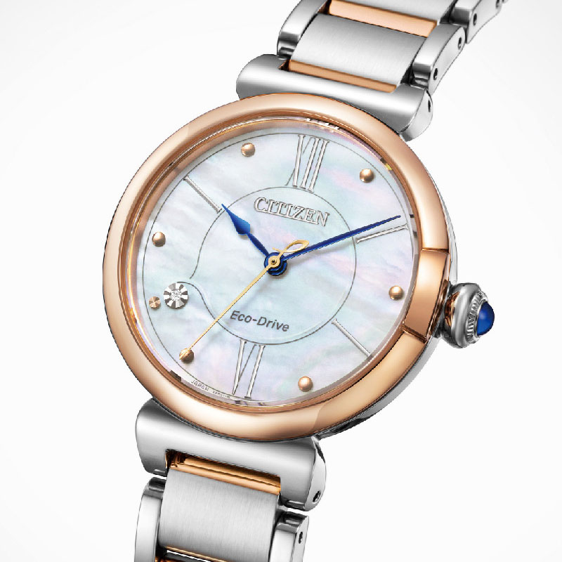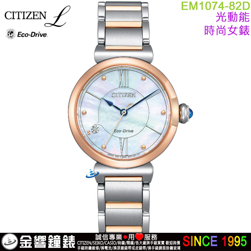 金響鐘錶精品購物網::專賣原廠公司貨:::歡迎議價或門市購買全年優惠 EST.1995 » CITIZEN系列 » L 錶款 » 【金響鐘錶】現貨,CITIZEN EM1074-82D(公司貨,保固2年):::CITIZEN L幸福鈴蘭,光動能,藍寶石鏡面,1顆鑽石,白蝶貝面板,時尚女錶,E031機芯,EM107482D |