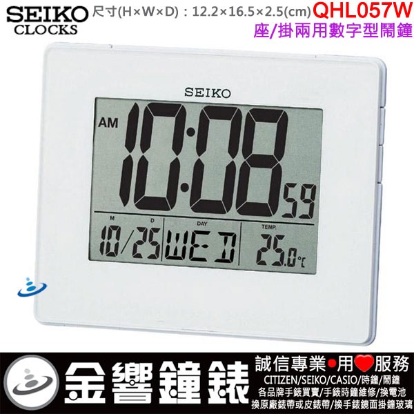 金響鐘錶精品購物網::專賣原廠公司貨:::歡迎議價或門市購買全年優惠 EST.1995 » 時鐘系列 » 鬧鐘 Alarm-Clocks » 數字型鬧鐘 » 【金響鐘錶】現貨,SEIKO QHL057W(公司貨,保固1年):::SEIKO Digital數位式電子鬧鐘,嗶嗶鬧鈴,貪睡,燈光,月日,星期,溫度,座掛兩用,QHL-057W |