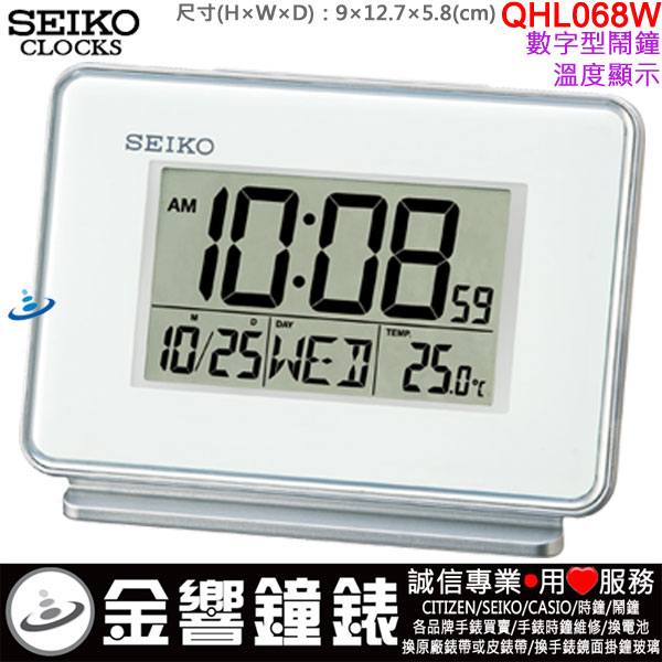金響鐘錶精品購物網::專賣原廠公司貨:::歡迎議價或門市購買全年優惠 EST.1995 » 時鐘系列 » 鬧鐘 Alarm-Clocks » 數字型鬧鐘 » 【金響鐘錶】現貨,SEIKO QHL068W(公司貨,保固1年):::SEIKO Digital數位式電子鬧鐘,雙鬧鐘,嗶嗶鬧鈴,貪睡,燈光,月日,星期,溫度,QHL-068W |