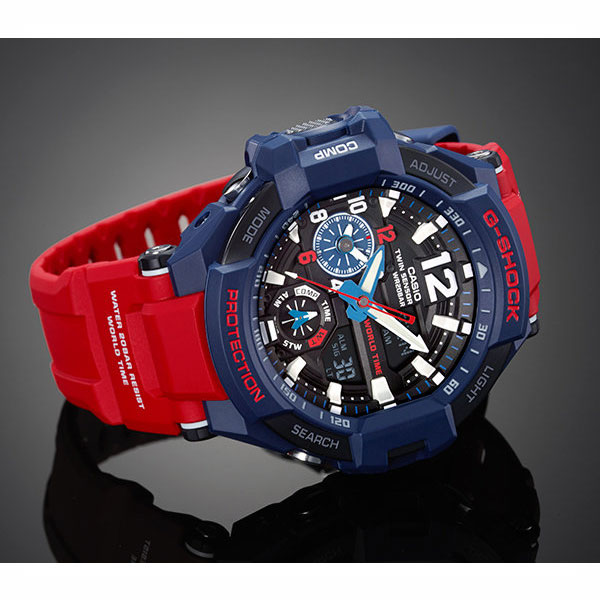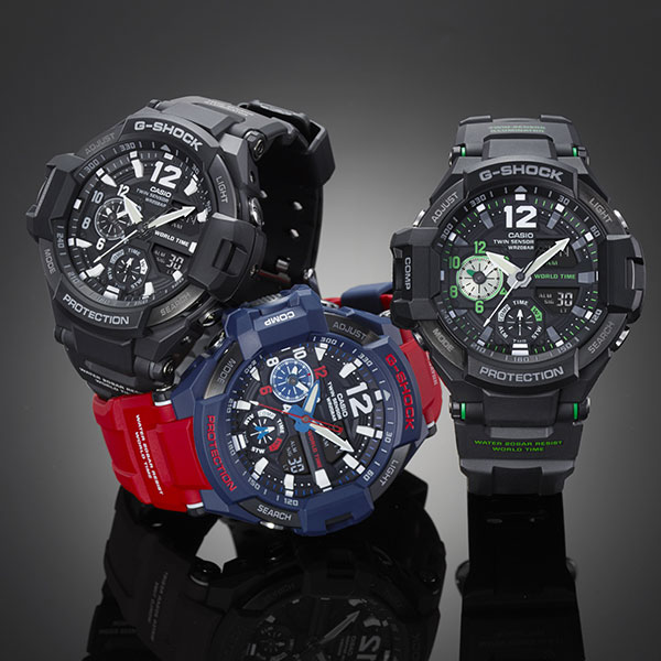 全新GRAVITY MASTER飛行錶款-GA-1100,採大型指針設計,並搭配第二時區顯示錶眼,能讓飛行員輕鬆掌握時間資訊。簡單輕按9點鐘方向的功能紐,即可進入連續60秒的方位測量與溫度感測,即使在黑暗中也能夠以高亮度LED照明讀取各項資訊。兼具耐衝擊構造、1/100秒計時碼錶、倒數計時等多項功能。