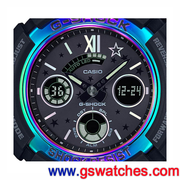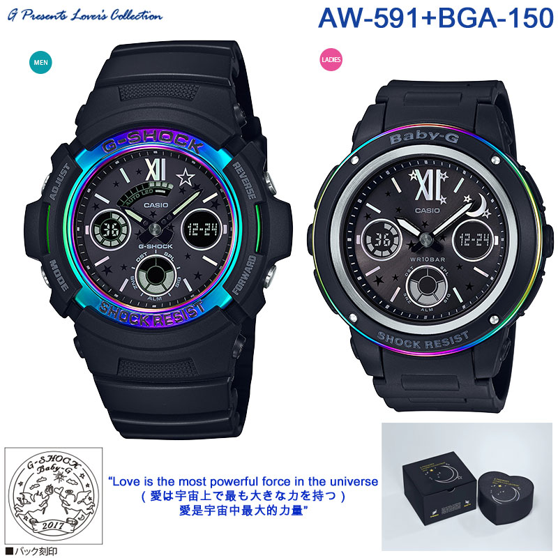 充滿甜蜜溫馨的聖誕節即將到來,CASIO推出2017全新LOVER’S COLLECTION聖誕限量對錶,今年共推出黑白兩組對錶,傳達愛是宇宙中最大的力量,因此設計靈感來自於宇宙的浪漫星空,將月亮和星星元素融入錶款設計中。LOV-17A聖誕對錶採用人氣暢銷款G-SHOCK GA-110及BABY-G BA-110為基礎型號,錶身為全白設計,同時有著白色雪花意象與無暇的氣息,並分別在G-SHOCK 及 BABY-G的錶盤與指針上以星星圖樣點綴;而LOV-17B基礎型號為G-SHOCK AW-591與BABY-G BGA-150,整體為黑色設計,猶如浩瀚的黑色宇宙,金屬錶圈則以彩虹漸層離子IP處理完成,兩款錶款在12點方向以羅馬數字設計,錶盤上同樣以星星及月亮點綴設計,以星星和月亮在宇宙中的關係代表著情人間緊密相聯的親密關係。兩組對錶錶背皆刻印上天使與惡魔圖樣,象徵著情人間密不可分的關係,並提供心型特殊錶盒包裝,在寒冷冬季中,G-SHOCK & BABY-G一同見證情人間珍貴的愛戀時刻,將為戀人們帶來最甜蜜的聖誕節。 《G-SHOCK AW-591》 ●錶殼 / 錶圈材質:橡膠 / 不鏽鋼