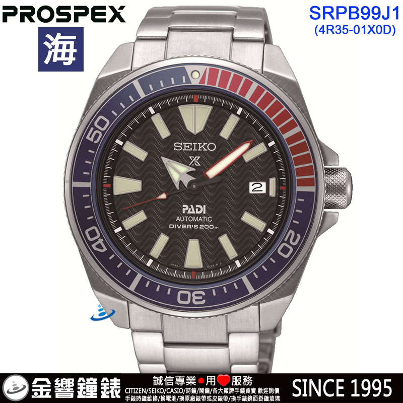 金響鐘錶精品購物網::專賣原廠公司貨:::歡迎議價或門市購買全年優惠 EST.1995 » SEIKO系列 » PROSPEX 錶款 » 客訂商品↘議價歡迎↘,SEIKO SRPB99J1(公司貨,保固2年):::海,PROSPEX,DIVER SCUBA,機械錶,刷卡或3期零利率,4R35-01X0D |