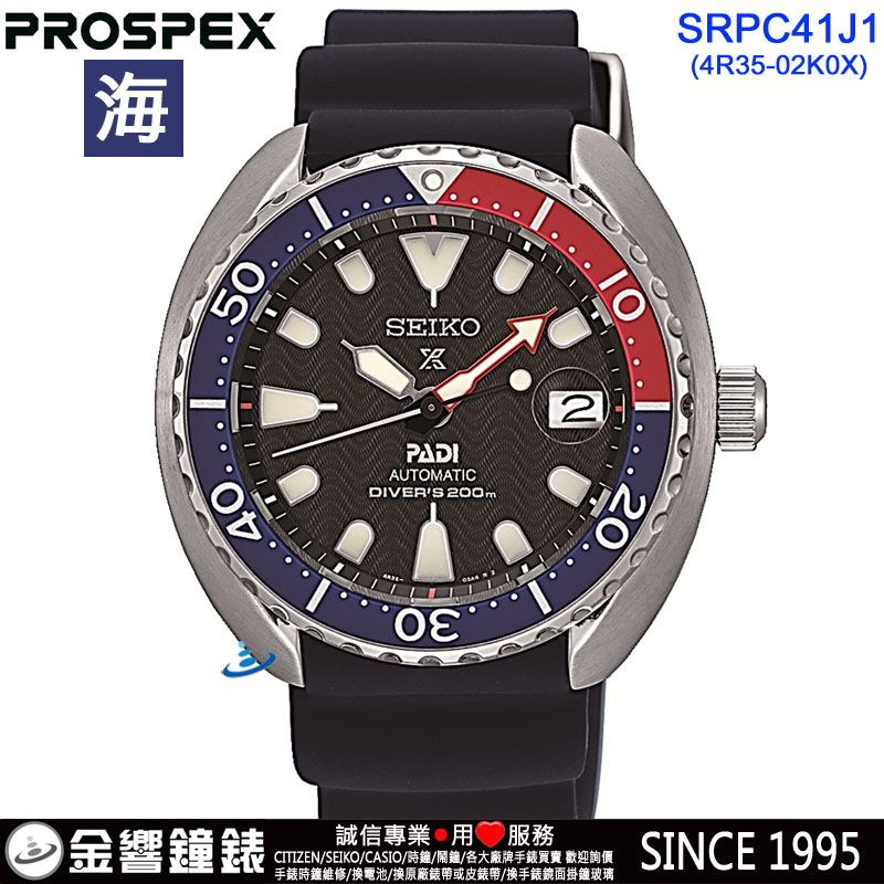 金響鐘錶精品購物網::專賣原廠公司貨:::歡迎議價或門市購買全年優惠 EST.1995 » SEIKO系列 » PROSPEX 錶款 » 客訂商品↘議價歡迎↘,SEIKO SRPC41J1(公司貨,保固2年):::海,PROSPEX,DIVER SCUBA,機械錶,刷卡或3期零利率,4R35-02K0X |