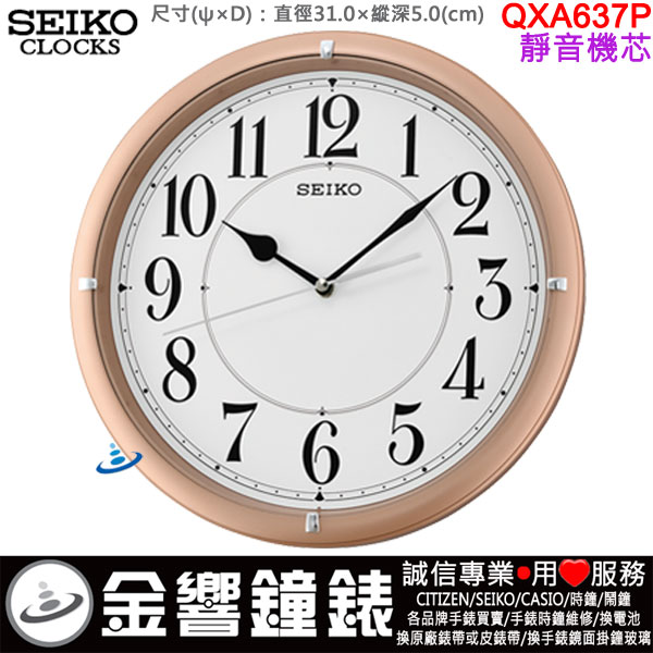 金響鐘錶精品購物網::專賣原廠公司貨:::歡迎議價或門市購買全年優惠 EST.1995 » 時鐘系列 » SEIKO 標準掛鐘 » SEIKO 標準掛鐘(滑動式秒針) » 【金響鐘錶】現貨,SEIKO QXA637P(公司貨,保固1年):::SEIKO 設計風掛鐘,靜音機芯,直徑31cm,時鐘,QXA-637P |