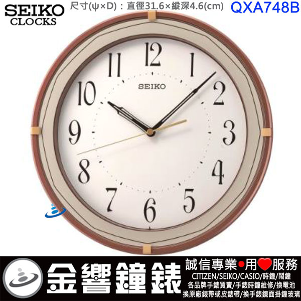 金響鐘錶精品購物網::專賣原廠公司貨:::歡迎議價或門市購買全年優惠 EST.1995 » 時鐘系列 » SEIKO 標準掛鐘 » SEIKO 標準掛鐘(滑動式秒針) » SEIKO QXA748B(公司貨,保固1年):::SEIKO,時尚掛鐘,滑動式秒針,直徑31.6cm,刷卡不加價,QXA-748B |
