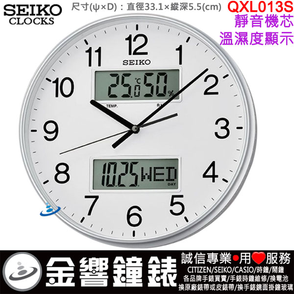 金響鐘錶精品購物網::專賣原廠公司貨:::歡迎議價或門市購買全年優惠 EST.1995 » 時鐘系列 » SEIKO 標準掛鐘 » SEIKO 標準掛鐘(滑動式秒針) » 【金響鐘錶】現貨,SEIKO QXL013S(公司貨,保固1年):::SEIKO 雙顯掛鐘,LCD星期日期顯示,溫度濕度顯示,靜音機芯,直徑33.1cm,時鐘,QXL-013S |
