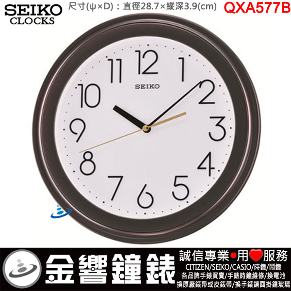 金響鐘錶精品購物網::專賣原廠公司貨:::歡迎議價或門市購買全年優惠 EST.1995 » 時鐘系列 » SEIKO 標準掛鐘 » SEIKO 標準掛鐘 » ●金響鐘錶,現貨,SEIKO QXA577B(公司貨,保固1年):::SEIKO 掛鐘,直徑28.7cm,時鐘,QXA-577B |