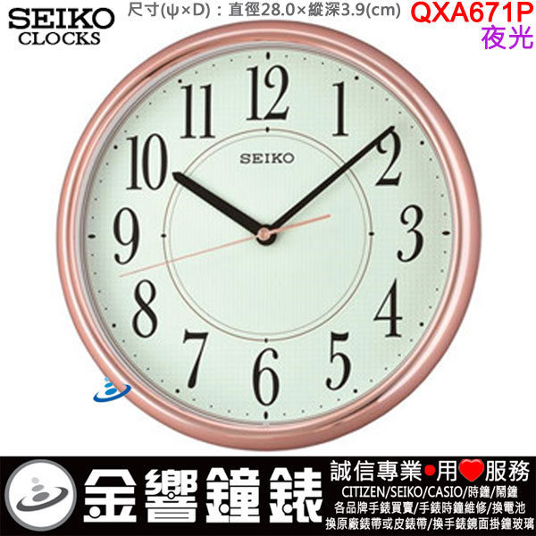 dot 金響鐘錶精品購物網::專賣原廠公司貨:::歡迎議價或門市購買全年優惠 EST.1995 » 時鐘系列 » SEIKO 標準掛鐘 » SEIKO 標準掛鐘 » 【金響鐘錶】現貨,SEIKO QXA671P(公司貨,保固1年):::SEIKO 時尚掛鐘,直徑28cm,夜光,時鐘,QXA-671P