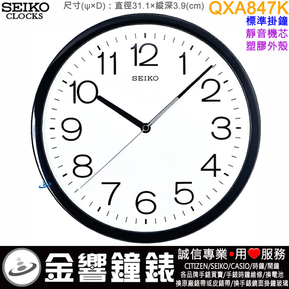 dot 金響鐘錶精品購物網::專賣原廠公司貨:::歡迎議價或門市購買全年優惠 EST.1995 » 時鐘系列 » SEIKO 標準掛鐘 » SEIKO 標準掛鐘(滑動式秒針) » ○金響鐘錶,缺貨,SEIKO QXA847K(公司貨,保固1年):::SEIKO時尚掛鐘,靜音機芯,塑膠外殼,直徑31.1cm,時鐘,QXA-847K