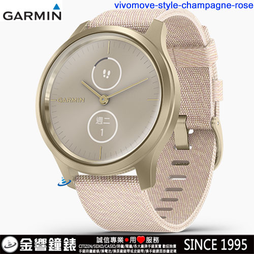 金響鐘錶精品購物網::專賣原廠公司貨:::歡迎議價或門市購買全年優惠 EST.1995 » 其他系列 » GARMIN運動手錶 » vívomove Style 指針智慧腕錶 » 【金響鐘錶】預購,GARMIN vivomove-style-champagne-rose櫻粉鉑砂金(公司貨,保固1年):::指針智慧腕錶,行動支付,多種運動模式,全天候健康監測,vivomovest |