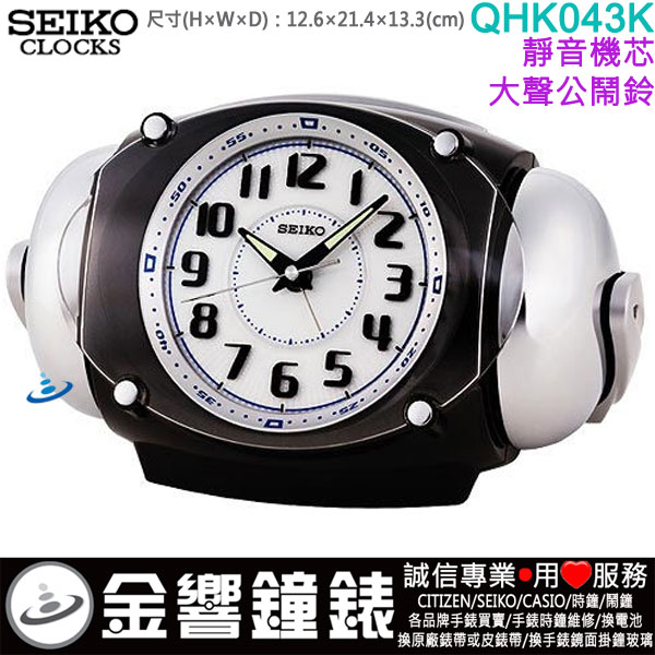 金響鐘錶精品購物網::專賣原廠公司貨:::歡迎議價或門市購買全年優惠 EST.1995 » 時鐘系列 » 鬧鐘 Alarm-Clocks » 指針型鬧鐘(滑動式秒針) » 【金響鐘錶】現貨,SEIKO QHK043K(公司貨,保固1年):::SEIKO指針型大聲公鬧鐘,滑動式秒針,貪睡,大音量鬧鈴,音量控制,夜光,燈光,QHK-043K |