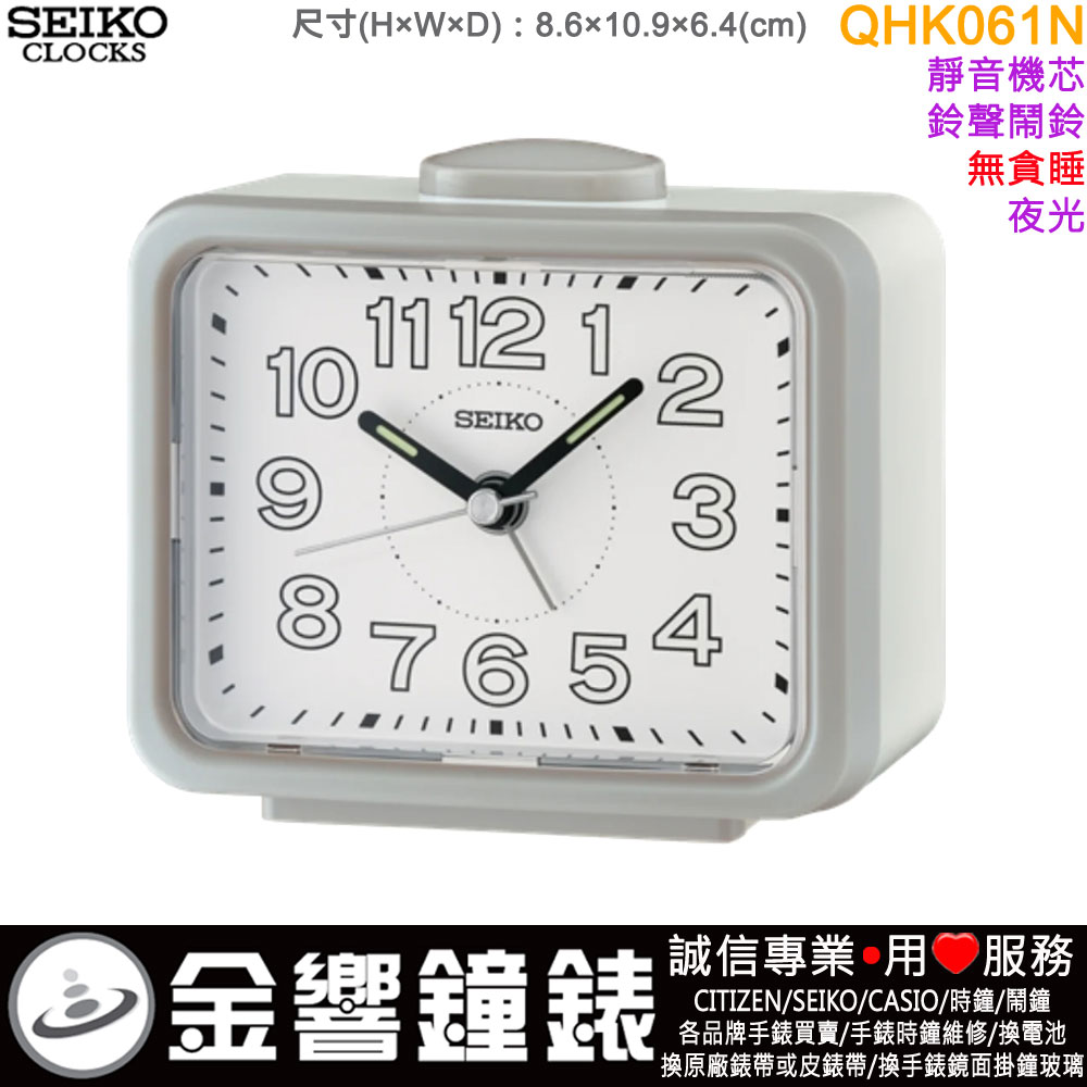 金響鐘錶精品購物網::專賣原廠公司貨:::歡迎議價或門市購買全年優惠 EST.1995 » 時鐘系列 » 鬧鐘 Alarm-Clocks » 指針型鬧鐘(滑動式秒針) » ●金響鐘錶,現貨,SEIKO QHK061N(公司貨,保固1年):::SEIKO,鈴聲鬧鈴,靜音機芯,無貪睡,夜光,QHK-061N |