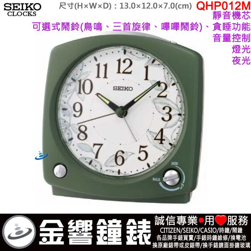 金響鐘錶精品購物網::專賣原廠公司貨:::歡迎議價或門市購買全年優惠 EST.1995 » 時鐘系列 » 鬧鐘 Alarm-Clocks » 指針型鬧鐘(滑動式秒針) » {金響鐘錶}現貨,SEIKO QHP012M(公司貨,保固1年):::SEIKO指針型鬧鐘,靜音機芯,鳥鳴,三首旋律,嗶嗶鬧鈴,夜光,燈光,貪睡,QHP-012M |