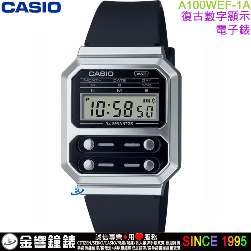 金響鐘錶精品購物網::專賣原廠公司貨:::歡迎議價或門市購買全年優惠 EST.1995 » CASIO系列 » FASHION 時尚錶款 » 【金響鐘錶】現貨,CASIO A100WEF-1ADF(公司貨,保固1年):::經典電子錶,復古造型設計,1/100碼錶,鬧鈴,A-100WEF |
