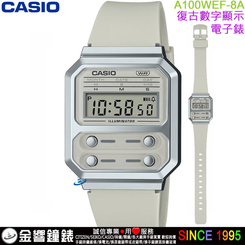 金響鐘錶精品購物網::專賣原廠公司貨:::歡迎議價或門市購買全年優惠 EST.1995 » CASIO系列 » FASHION 時尚錶款 » 【金響鐘錶】現貨,CASIO A100WEF-8ADF(公司貨,保固1年):::經典電子錶,復古造型設計,1/100碼錶,鬧鈴,A-100WEF |