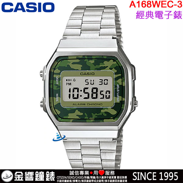 金響鐘錶精品購物網::專賣原廠公司貨:::歡迎議價或門市購買全年優惠 EST.1995 » CASIO系列 » FASHION 時尚錶款 » 【金響鐘錶】現貨,CASIO A168WEC-3(公司貨,保固1年):::經典電子錶,復古造型設計,1/100碼錶,鬧鈴,A-168WEC |
