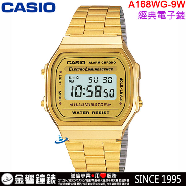 金響鐘錶精品購物網::專賣原廠公司貨:::歡迎議價或門市購買全年優惠 EST.1995 » CASIO系列 » FASHION 時尚錶款 » 【金響鐘錶】現貨,CASIO A168WG-9W(公司貨,保固1年):::經典電子錶,復古造型設計,1/100碼錶,鬧鈴,手錶,A-168WG |