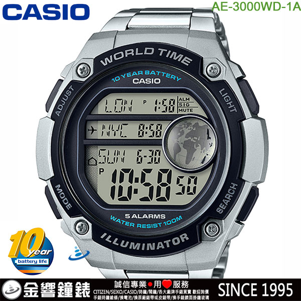 金響鐘錶精品購物網::專賣原廠公司貨:::歡迎議價或門市購買全年優惠 EST.1995 » CASIO系列 » FASHION 時尚錶款 » 缺貨,CASIO AE-3000WD-1A(公司貨,保固1年):::10年電力,電子錶,運動風錶面,防水100米,世界時間,計時碼錶,刷卡或3期零利率,AE3000WD |