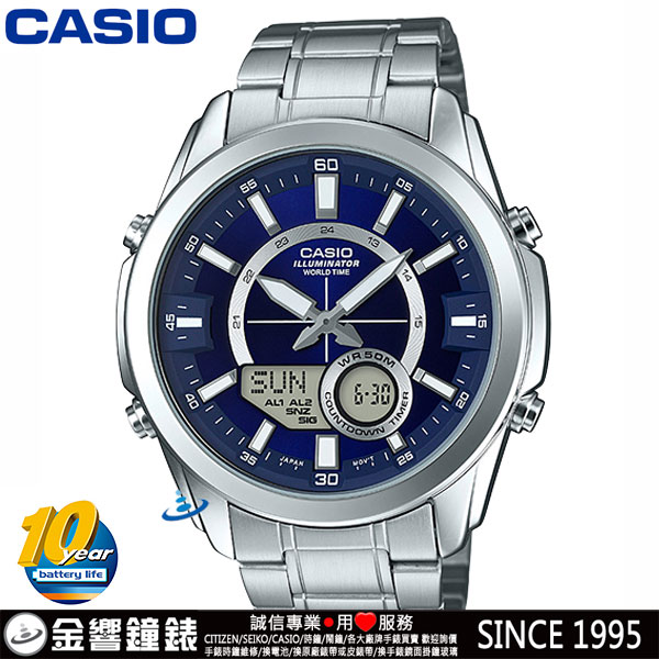 金響鐘錶精品購物網::專賣原廠公司貨:::歡迎議價或門市購買全年優惠 EST.1995 » CASIO系列 » FASHION 時尚錶款 » 客訂商品,CASIO AMW-810D-2A(公司貨,保固1年):::10年電力,指針數字雙顯,防水50米,30組電話,,世界時間,碼表,鬧鈴,刷卡或3期零利率,AMW810D |