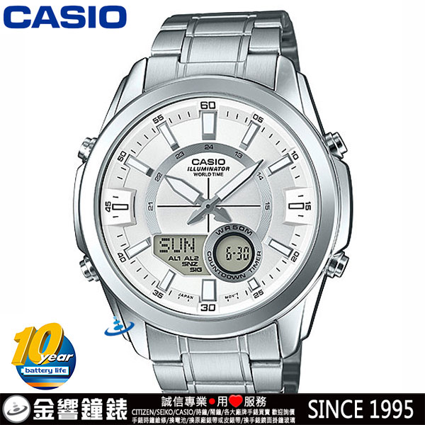 金響鐘錶精品購物網::專賣原廠公司貨:::歡迎議價或門市購買全年優惠 EST.1995 » CASIO系列 » FASHION 時尚錶款 » 客訂商品,CASIO AMW-810D-7A(公司貨,保固1年):::10年電力,指針數字雙顯,防水50米,30組電話,,世界時間,碼表,鬧鈴,刷卡或3期零利率,AMW810D |