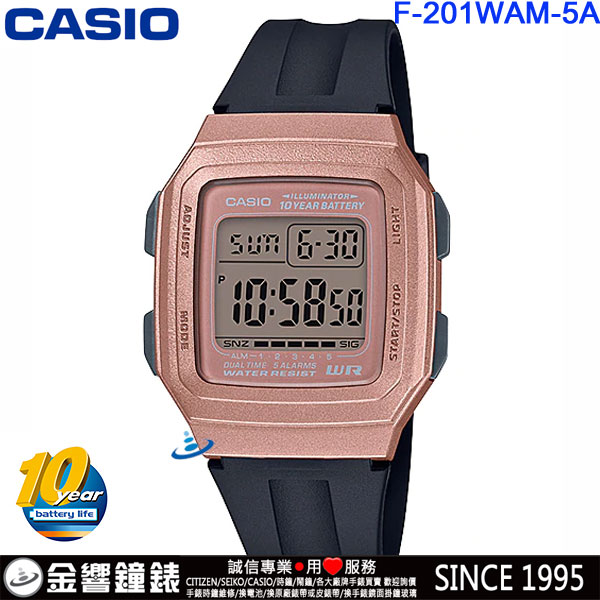 金響鐘錶精品購物網::專賣原廠公司貨:::歡迎議價或門市購買全年優惠 EST.1995 » CASIO系列 » FASHION 時尚錶款 » 客訂商品,CASIO F-201WAM-5AVDF(公司貨,保固1年):::10年電池,電子運動錶,世界時間,計時碼錶,鬧鈴,夜間照明,刷卡或3期零利率,F201WAM |