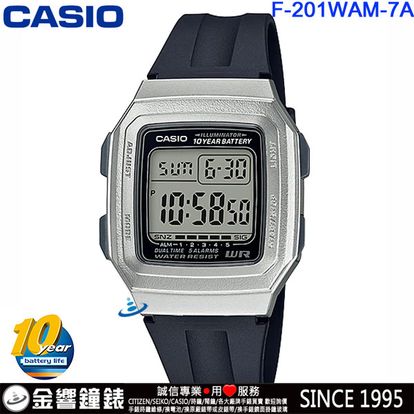 金響鐘錶精品購物網::專賣原廠公司貨:::歡迎議價或門市購買全年優惠 EST.1995 » CASIO系列 » FASHION 時尚錶款 » 客訂商品,CASIO F-201WAM-7AVDF(公司貨,保固1年):::10年電池,電子運動錶,世界時間,計時碼錶,鬧鈴,夜間照明,刷卡或3期零利率,F201WAM |