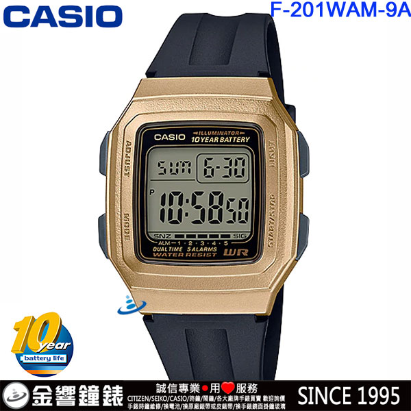 金響鐘錶精品購物網::專賣原廠公司貨:::歡迎議價或門市購買全年優惠 EST.1995 » CASIO系列 » FASHION 時尚錶款 » CASIO F-201WAM-9AVDF(公司貨,保固1年):::10年電池,電子運動錶,世界時間,計時碼錶,鬧鈴,夜間照明,刷卡或3期零利率,F201WAM |