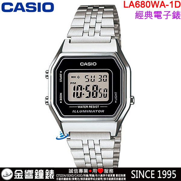 dot 金響鐘錶精品購物網::專賣原廠公司貨:::歡迎議價或門市購買全年優惠 EST.1995 » CASIO系列 » FASHION 時尚錶款 » 【金響鐘錶】現貨,CASIO LA680WA-1DF(公司貨,保固1年):::復古數字型電子錶,1/100碼錶,鬧鈴,手錶,LA680WA