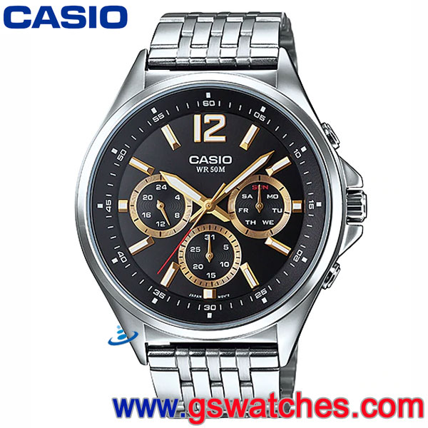 金響鐘錶精品購物網::專賣原廠公司貨:::歡迎議價或門市購買全年優惠 EST.1995 » CASIO系列 » FASHION 時尚錶款 » 客訂商品,CASIO MTP-E303D-1AVDF(公司貨,保固1年):::指針男錶,經典大方,三眼六針,不鏽鋼錶帶,星期,日期,24時制,刷卡或3期零利率,MTPE303D |