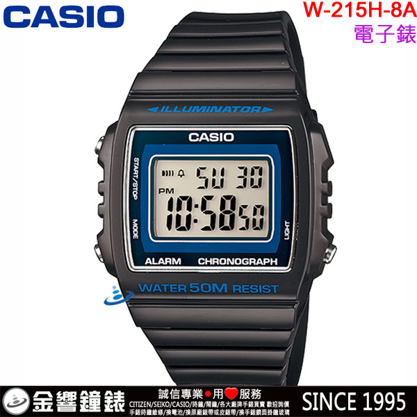 金響鐘錶精品購物網::專賣原廠公司貨:::歡迎議價或門市購買全年優惠 EST.1995 » CASIO系列 » FASHION 時尚錶款 » 【金響鐘錶】預購,CASIO W-215H-8AVDF(公司貨,保固1年):::方形數字錶,大型液晶錶面,LED照明,碼錶,每日鬧鈴,手錶,W215H |