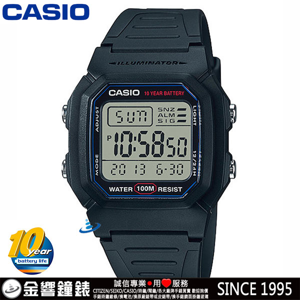 金響鐘錶精品購物網::專賣原廠公司貨:::歡迎議價或門市購買全年優惠 EST.1995 » CASIO系列 » FASHION 時尚錶款 » 客訂商品,CASIO W-800H-1A(公司貨,保固1年):::10年電力,經典造型,防水100米,兩地時間,多功能鬧鈴,自動LED背光,刷卡或3期零利率,W800H |